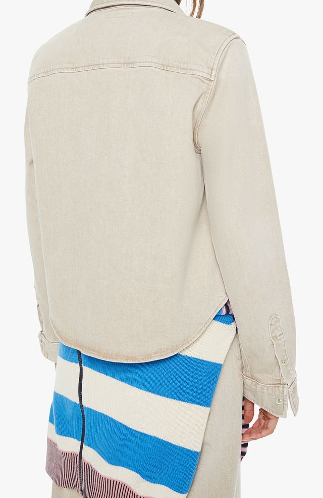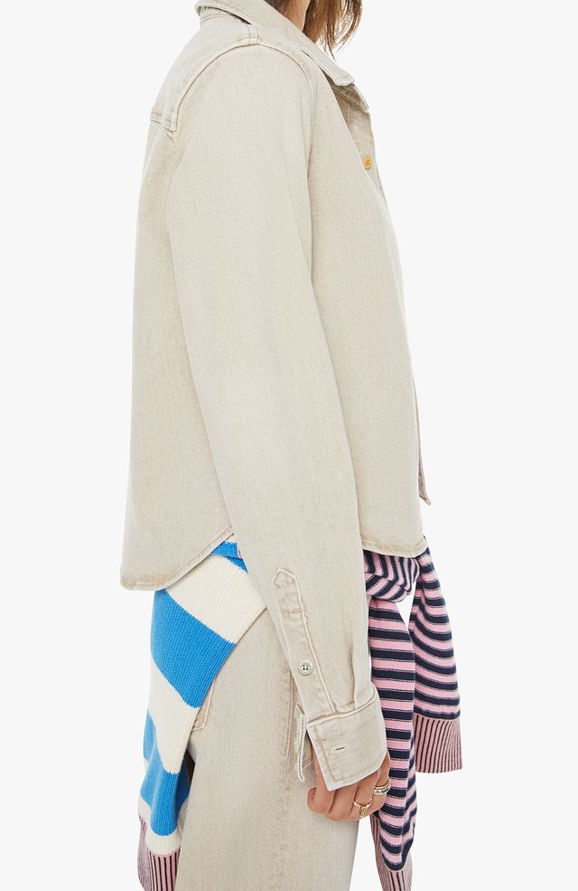 A button-up denim top with a front patch pocket and a curved, cropped hem. Made from semi-rigid SUPERIOR denim, Caramel is a faded khaki with tan stitching and shell-inspired buttons.