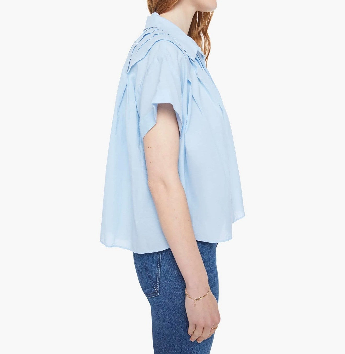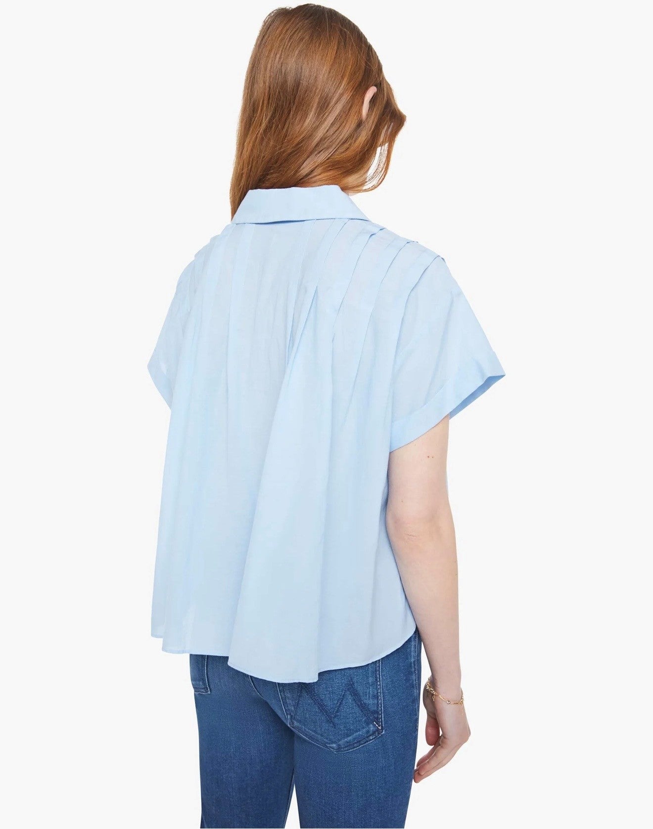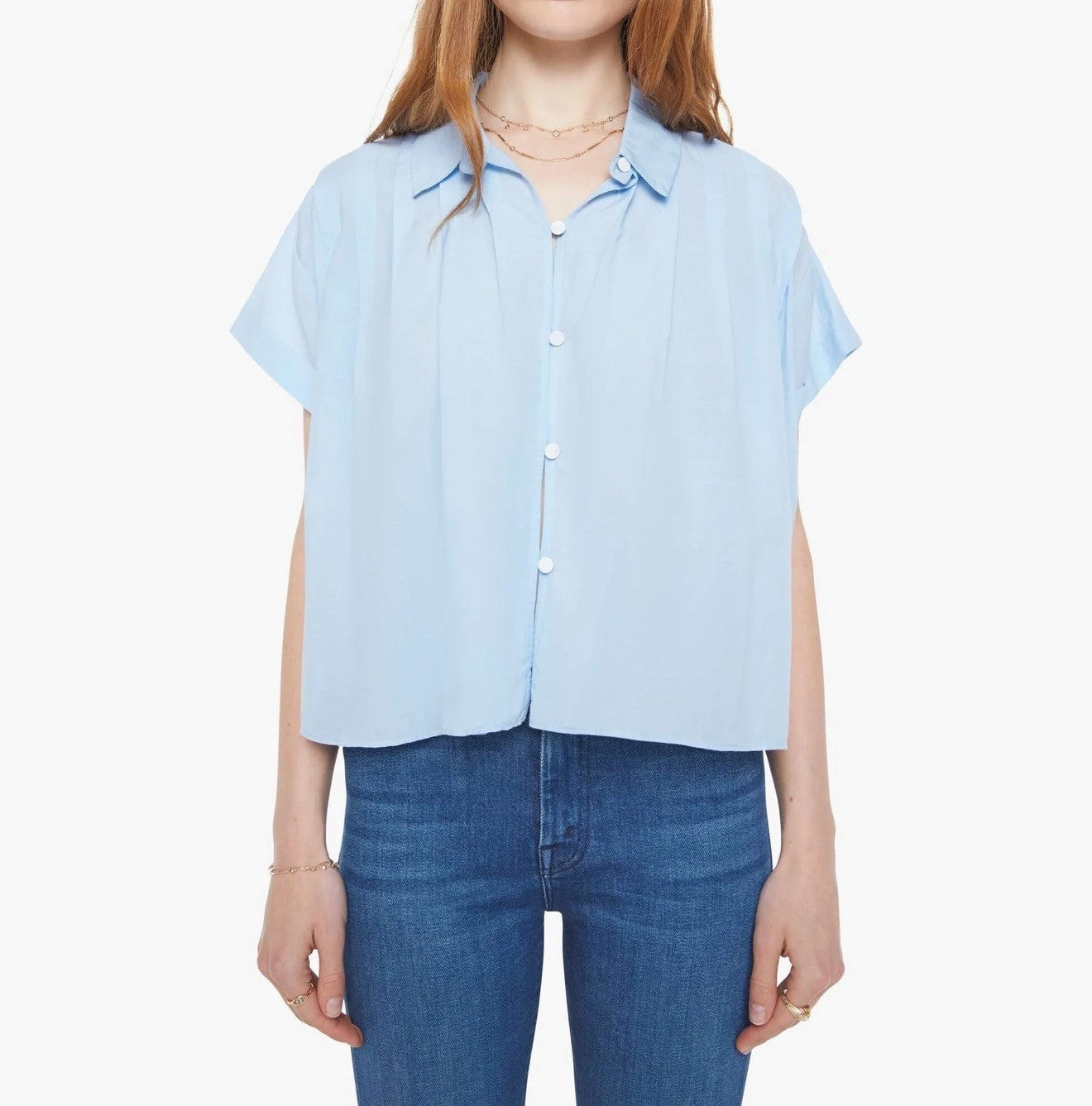 A boxy short-sleeved button-up with drop shoulders, pleats across the chest and back and a cropped hem. Made from a cotton blend, Blue Bell is a baby blue with white buttons down the front.
