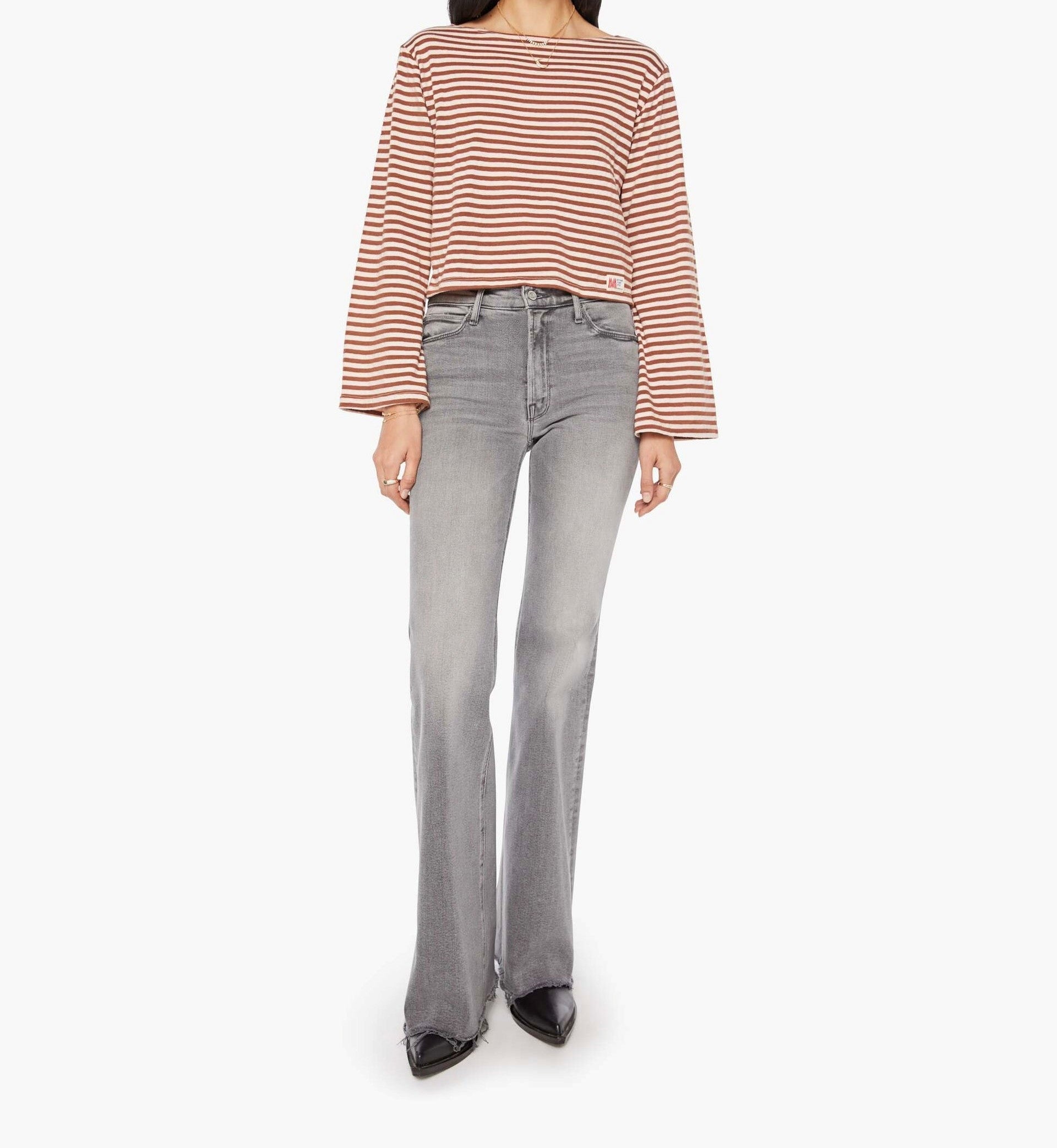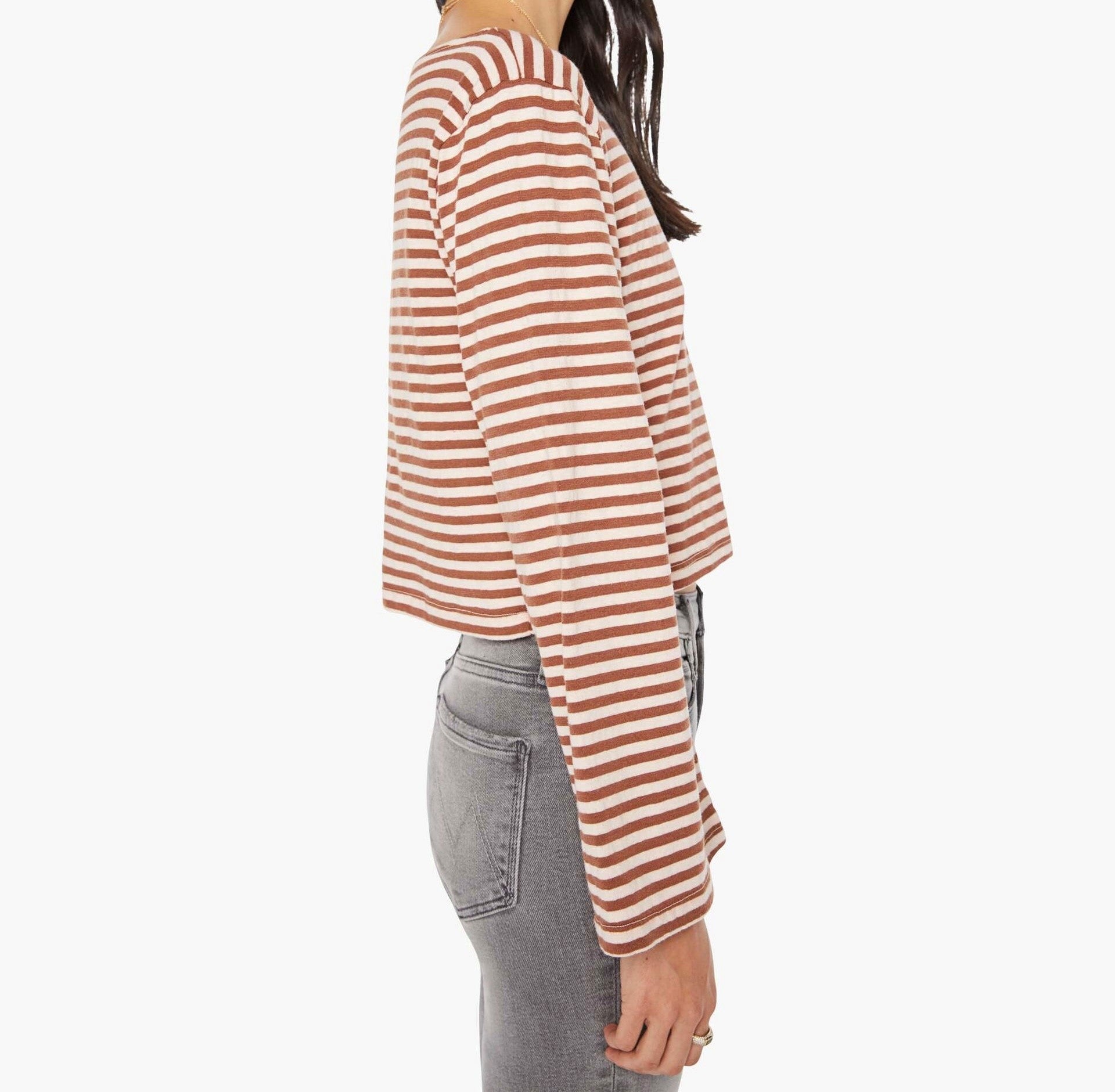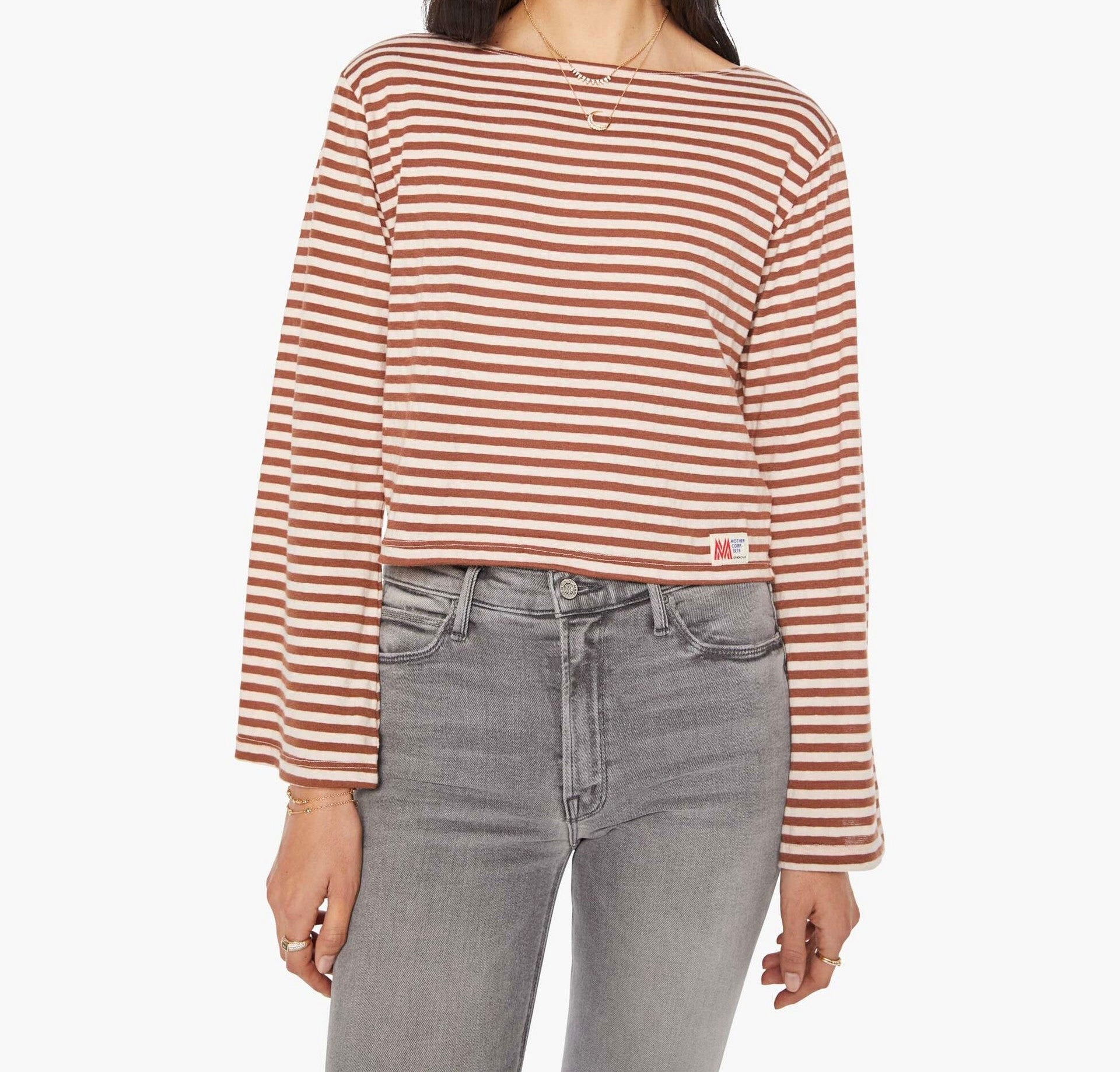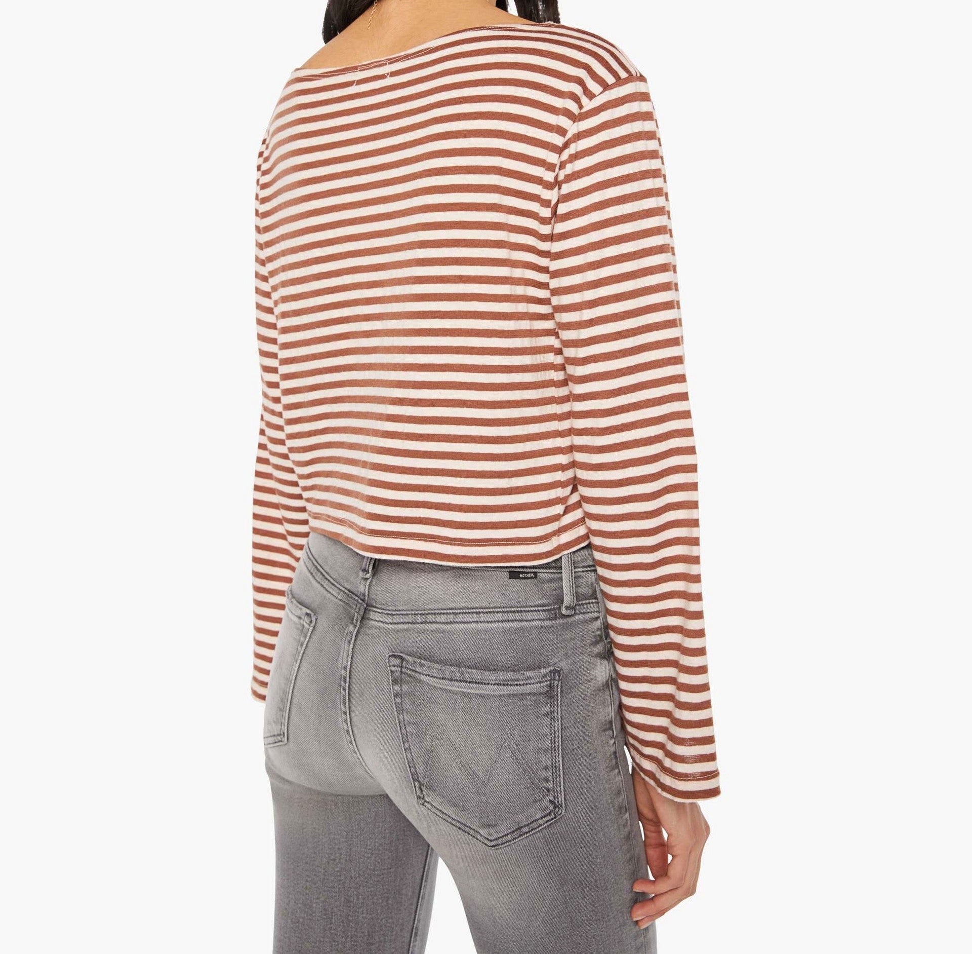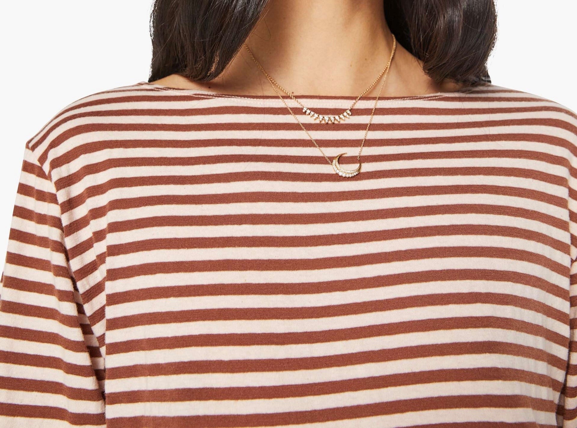A long sleeve tee with a boat neck and boxy fit. Made from stretch cotton, the top is designed in horizontal brown-and-white stripes.