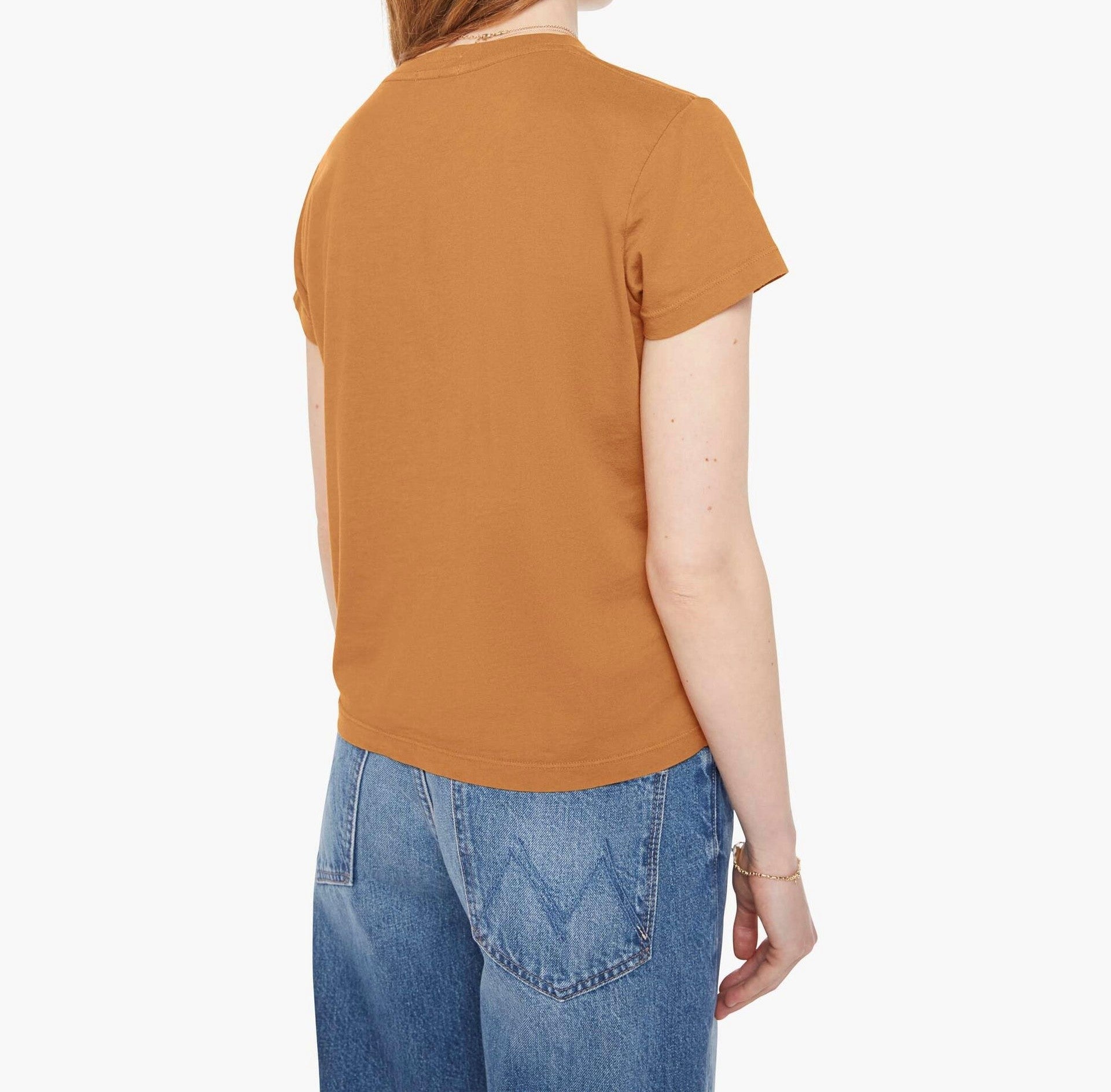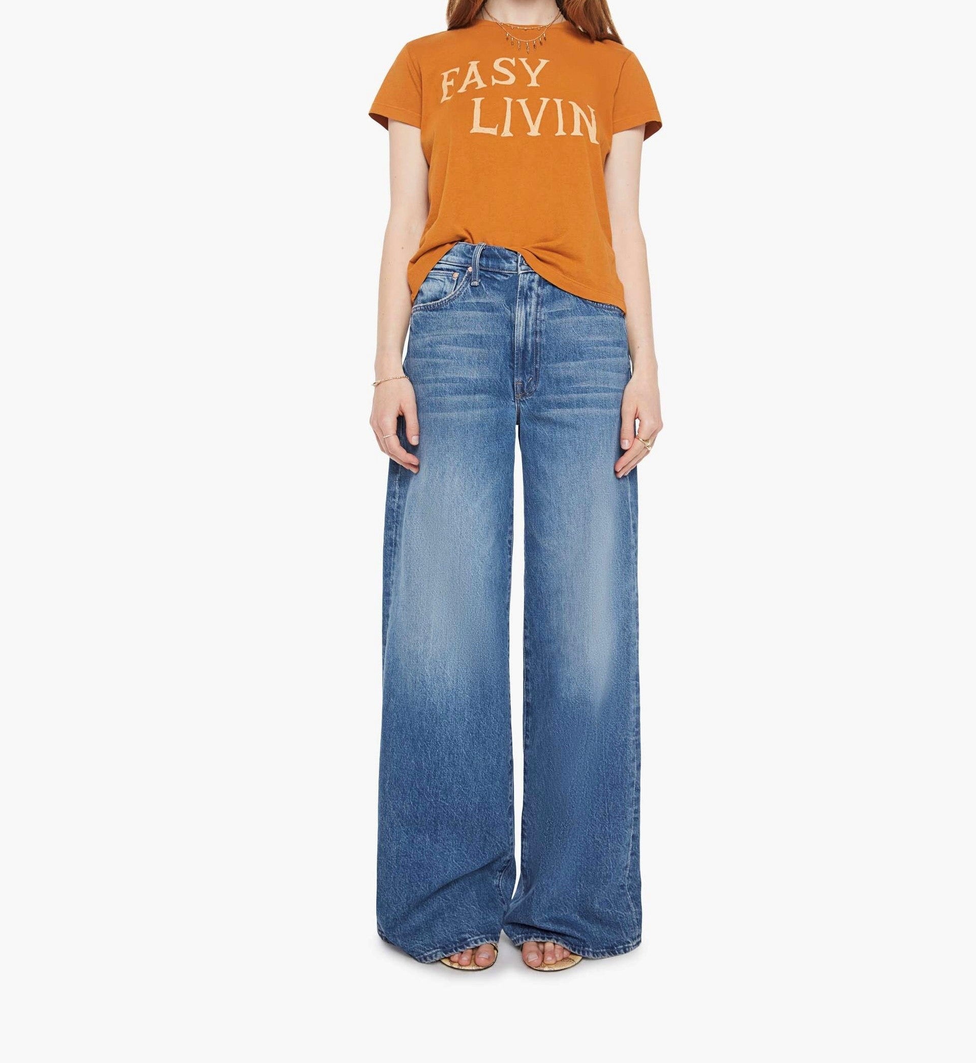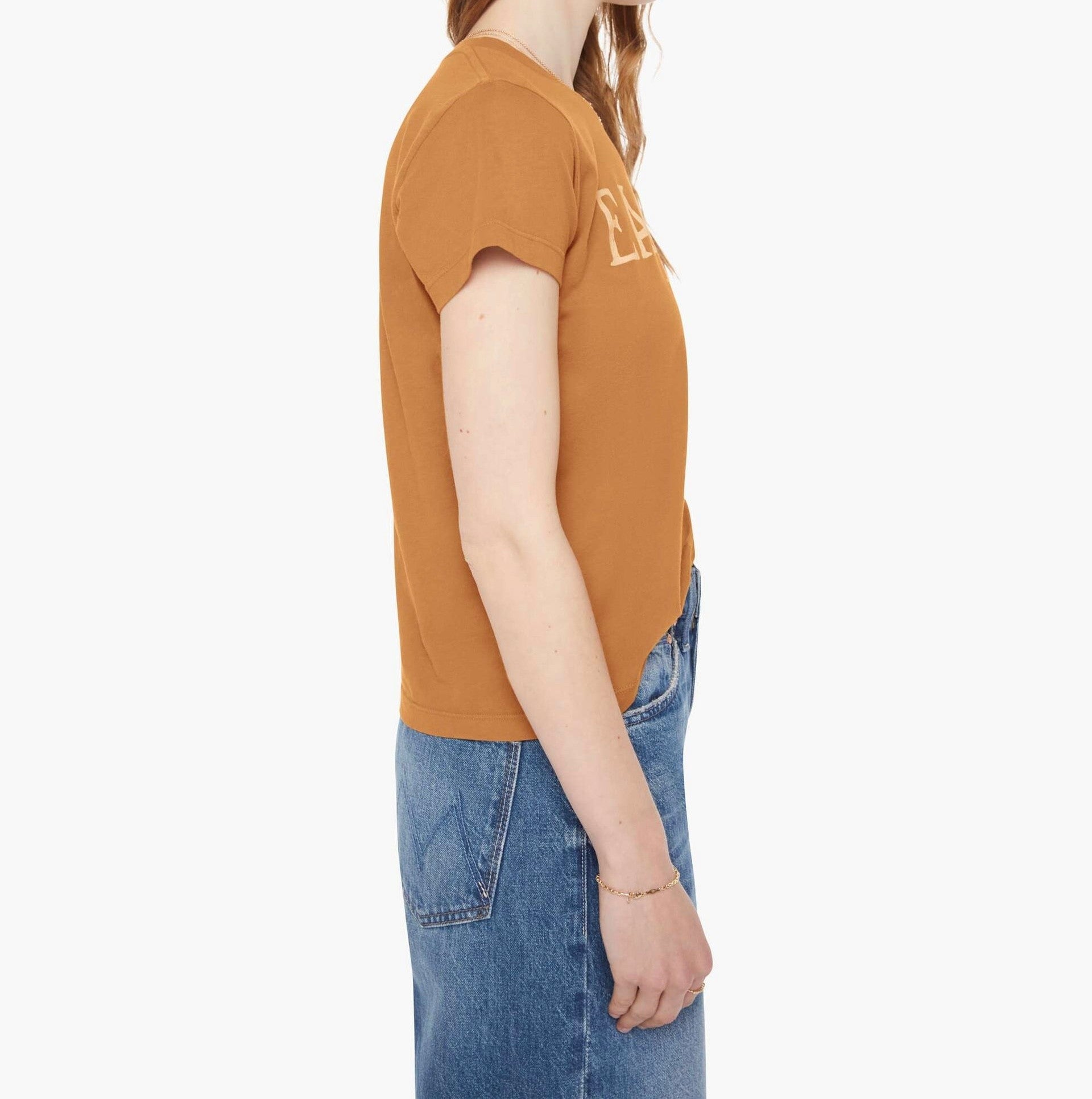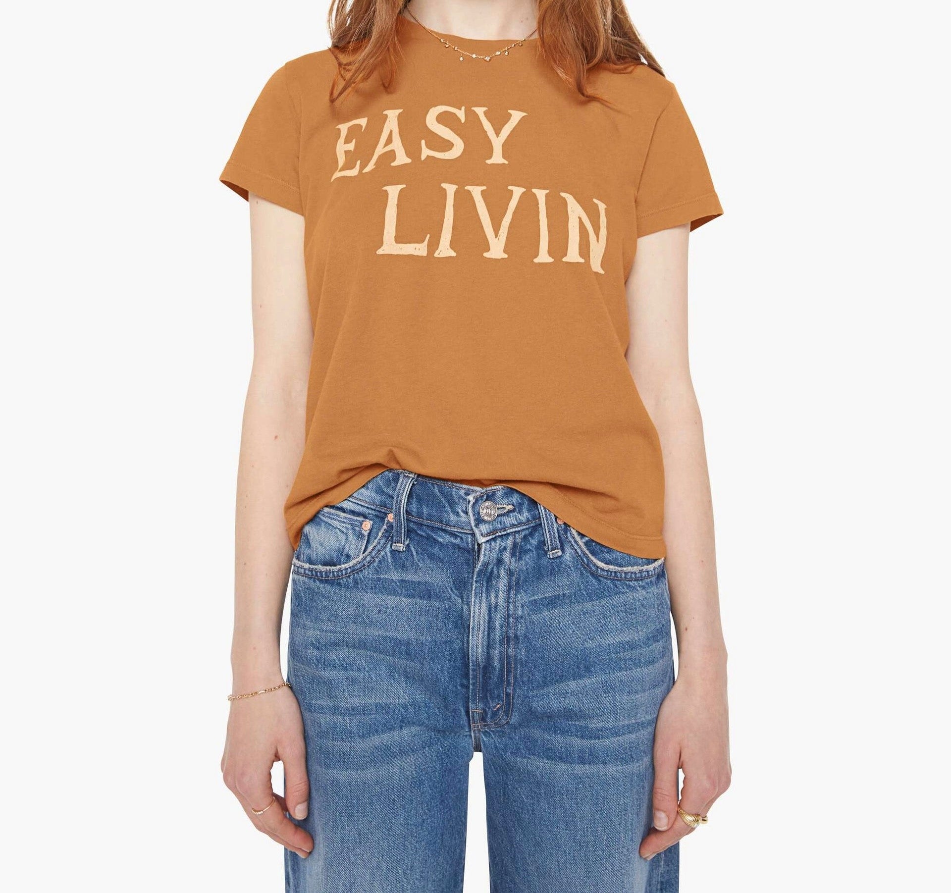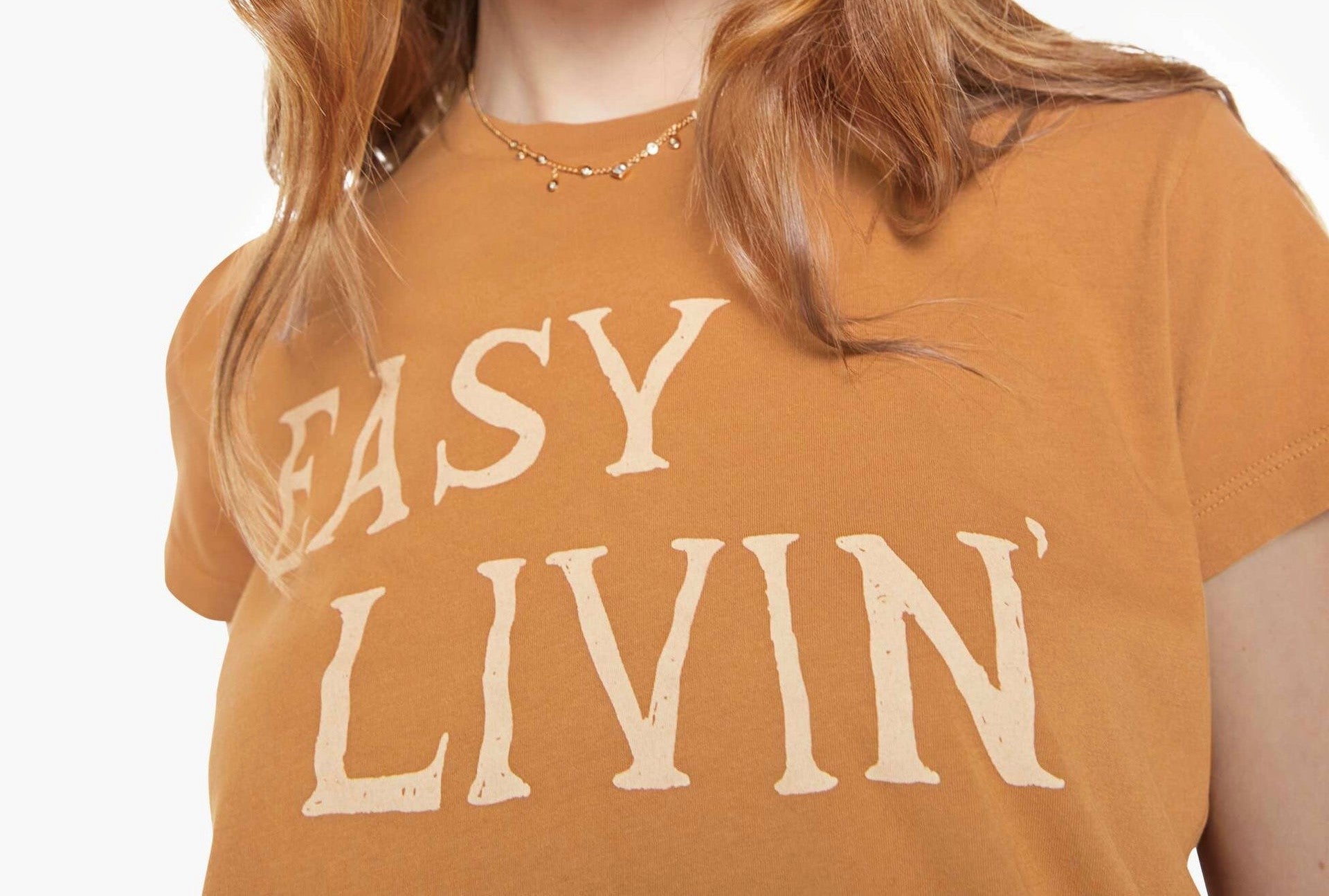 Livin' the dream. A soft crewneck with a slim fit for a vintage look and feel. Made from 100% supima cotton in dark khaki, The Boxy Goodie Goodie in Easy Livin' features text in cream on the front.