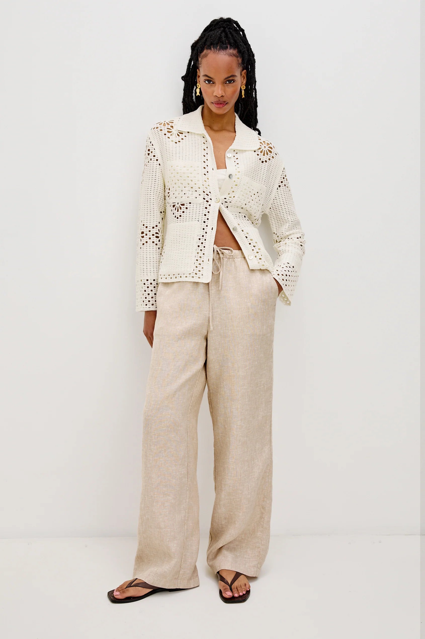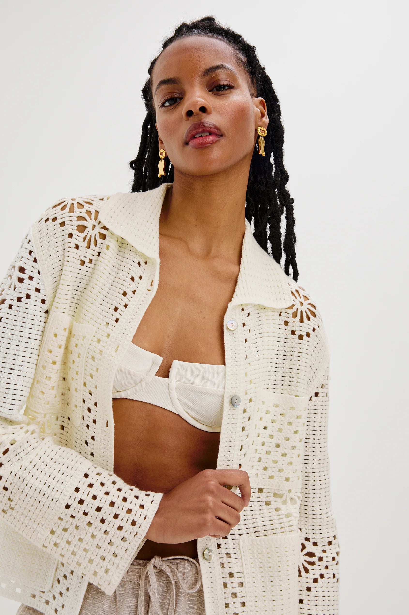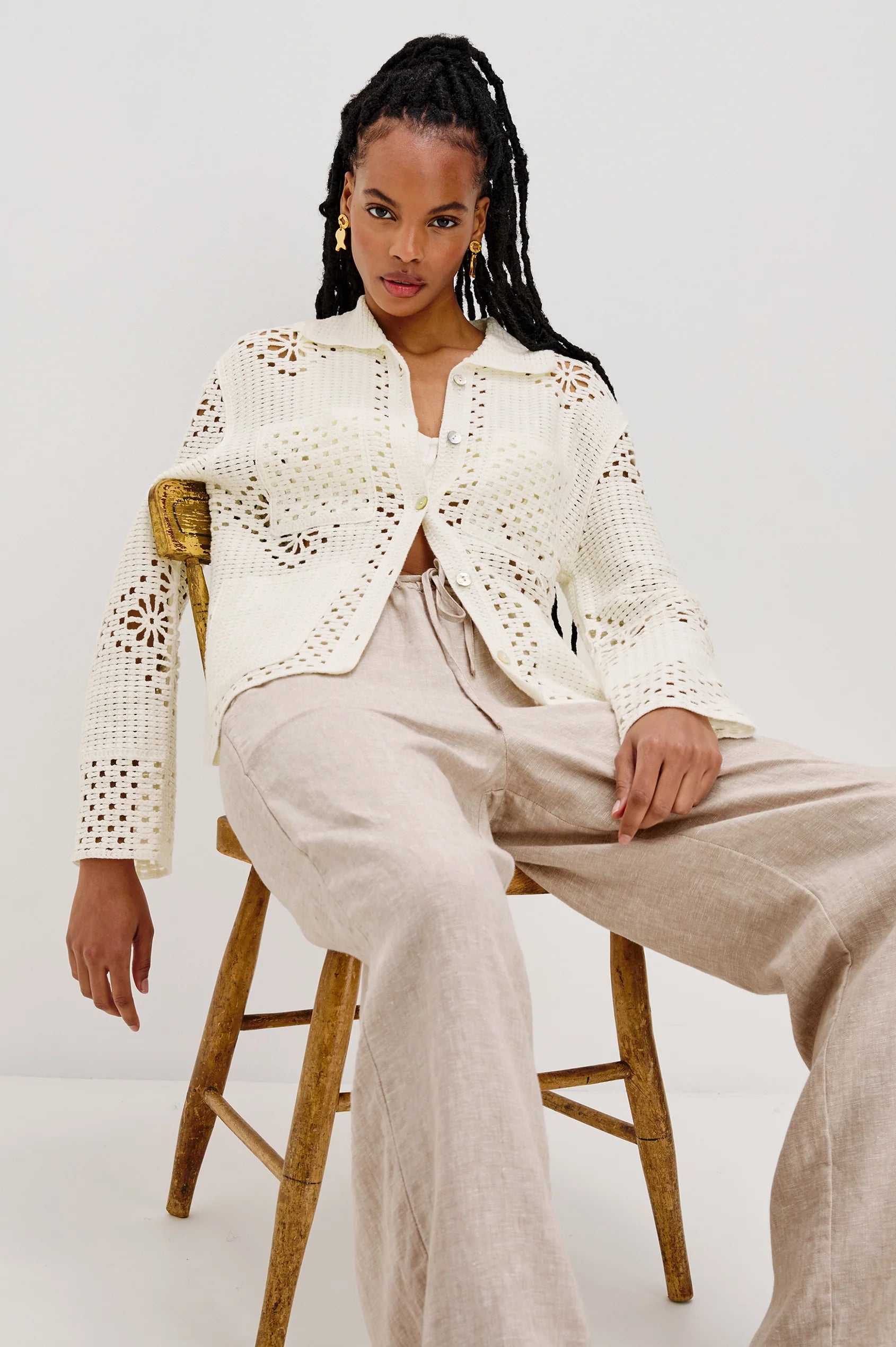 The Patmos is a button-up knit featuring eyelet details and natural shell buttons. Made in a soft cotton crochet that's ideal for a breezy beach day or paired with jeans.
