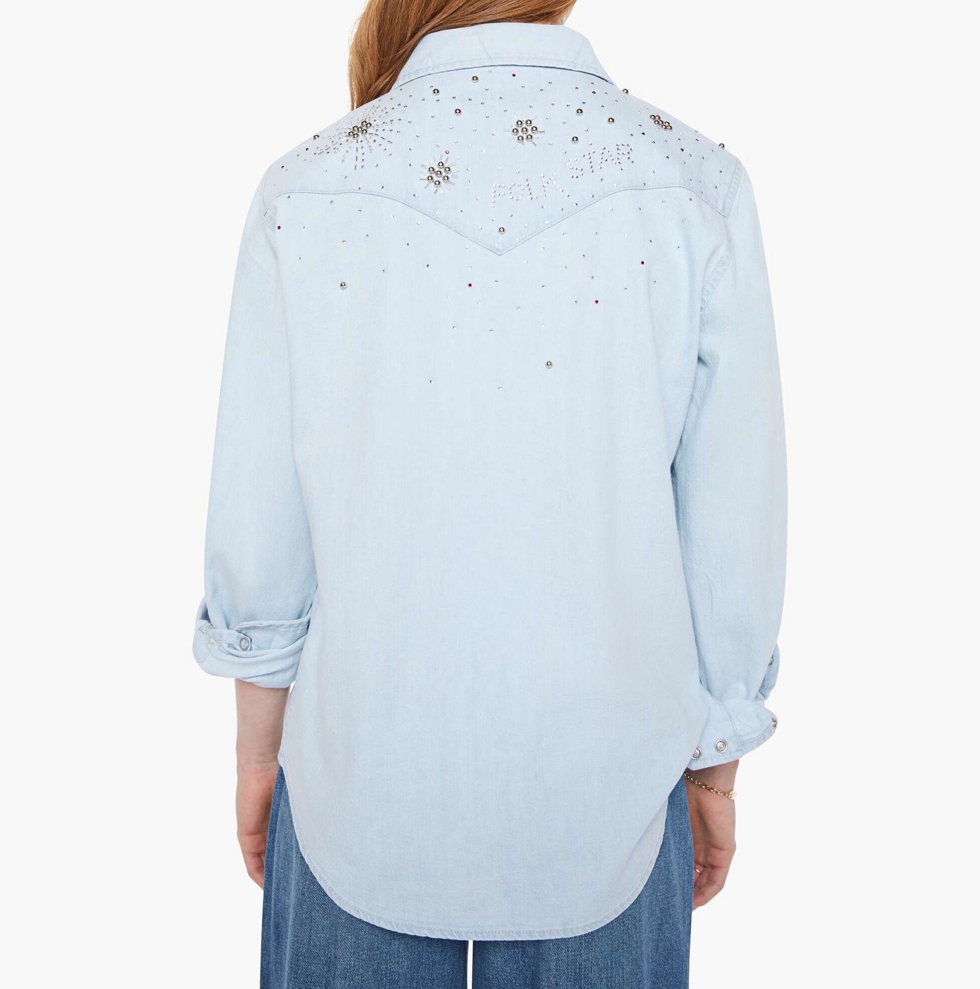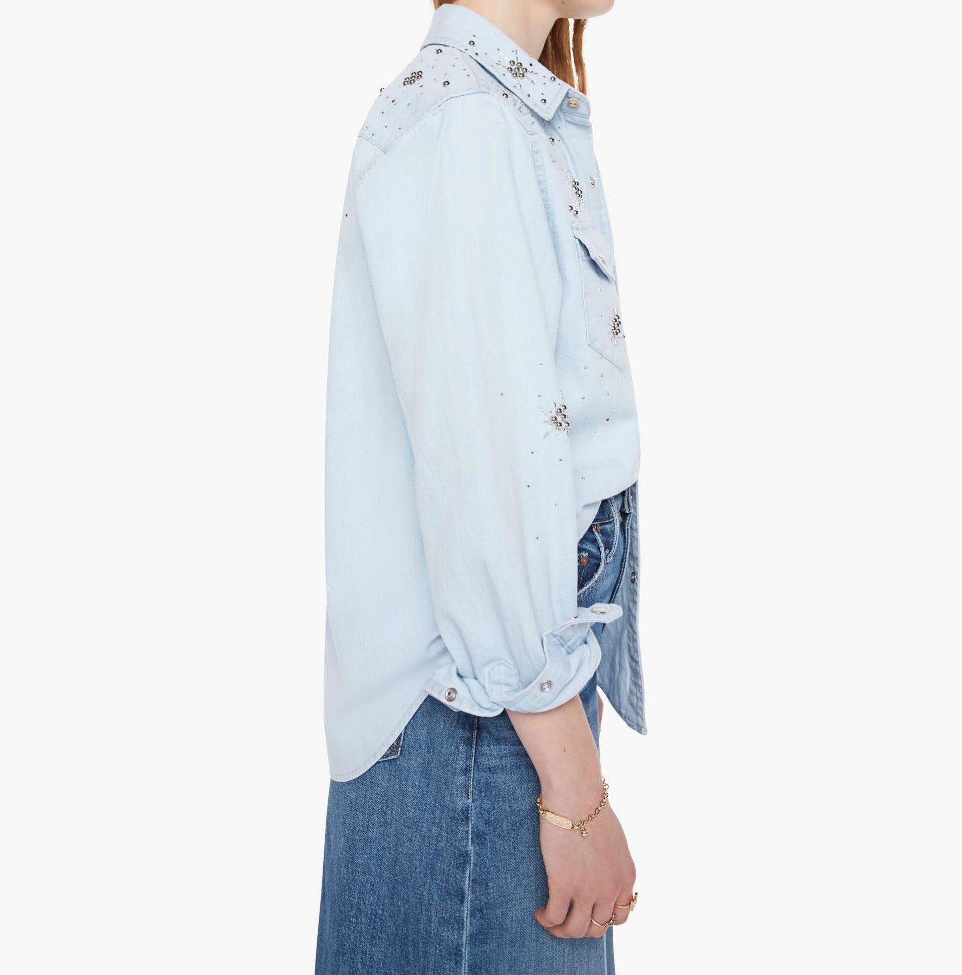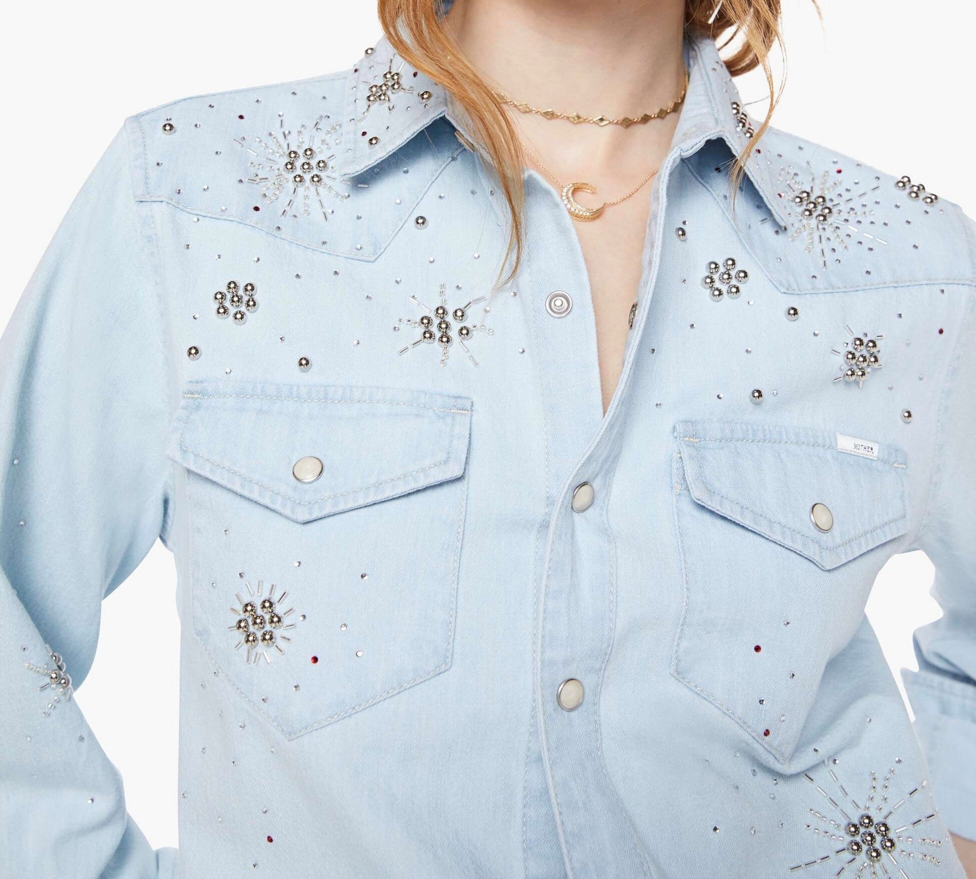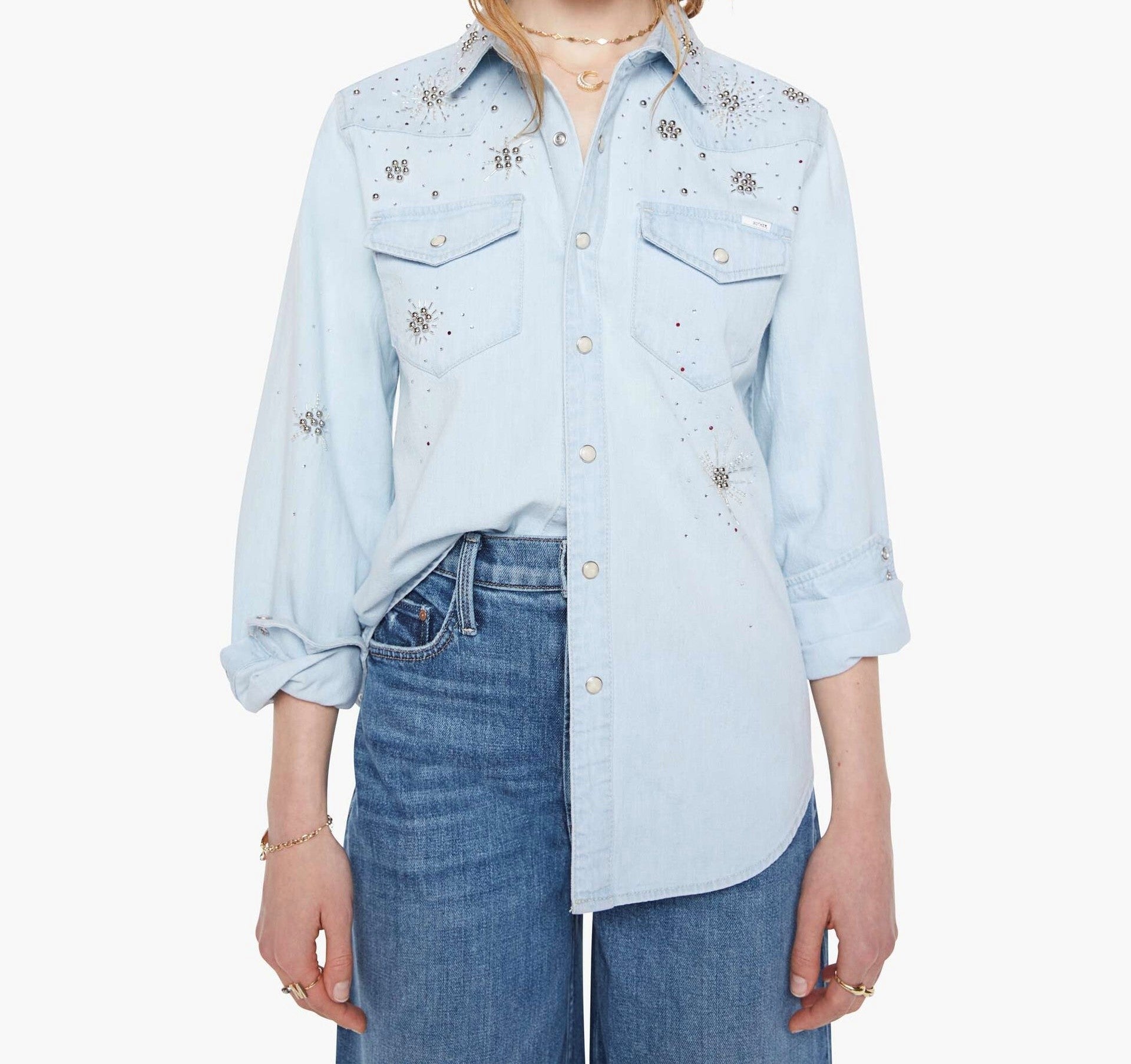 Never enough. A Western-inspired denim button-up with front patch pockets and a curved hem. Made from 100% cotton, More Is More is a faded light blue with faux pearl snaps down the front and beaded details with rhinestones across the shoulders and chest.