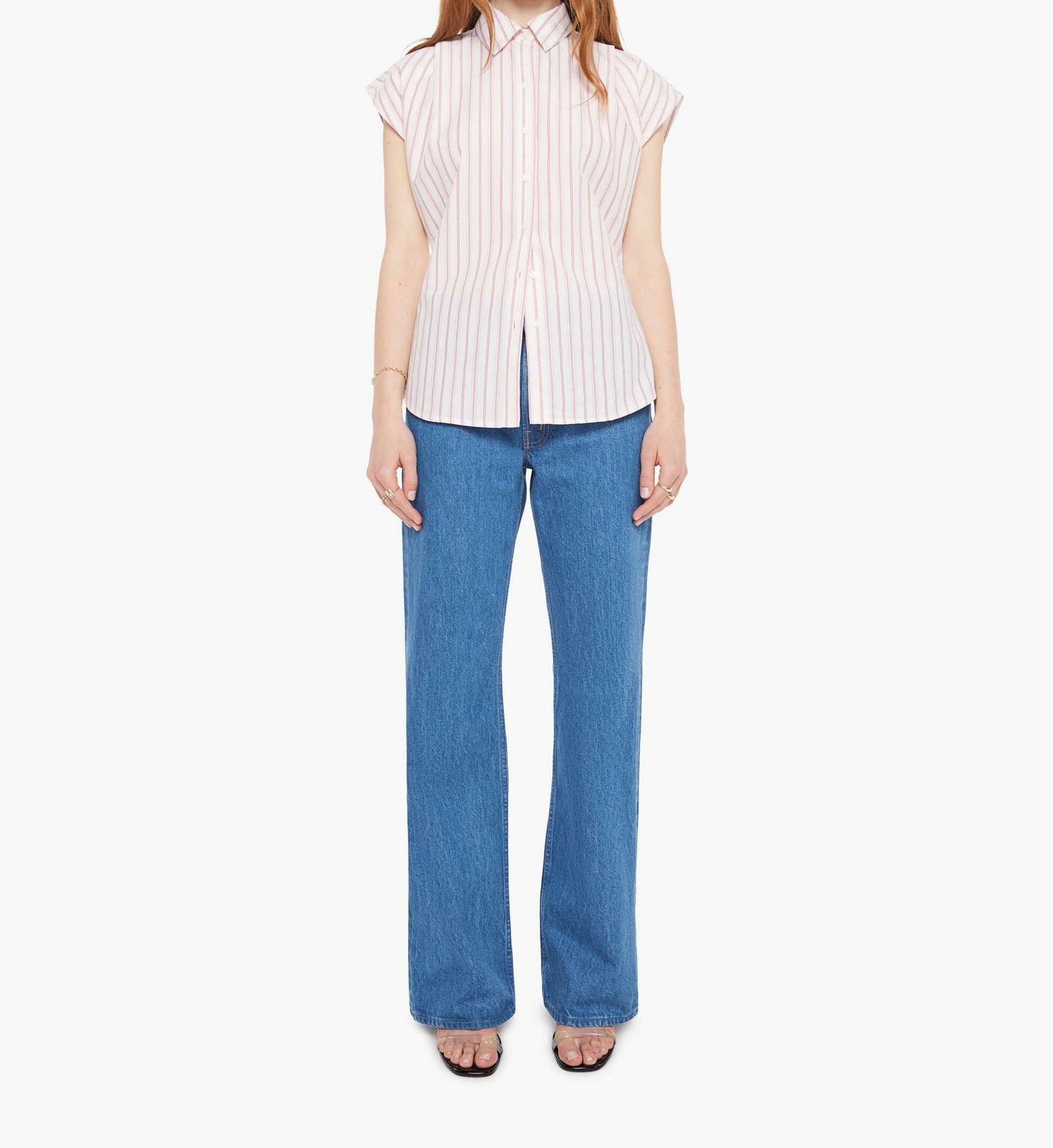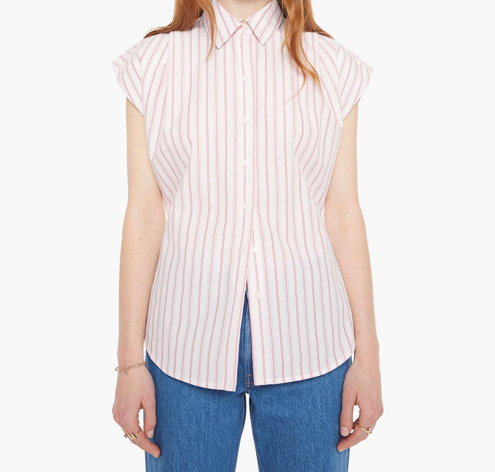 Cross the line. A short-sleeve button-up with an angled bodice and a curved hem. Made from 100% cotton, Line Breaker is a white and light pink stripe pattern.