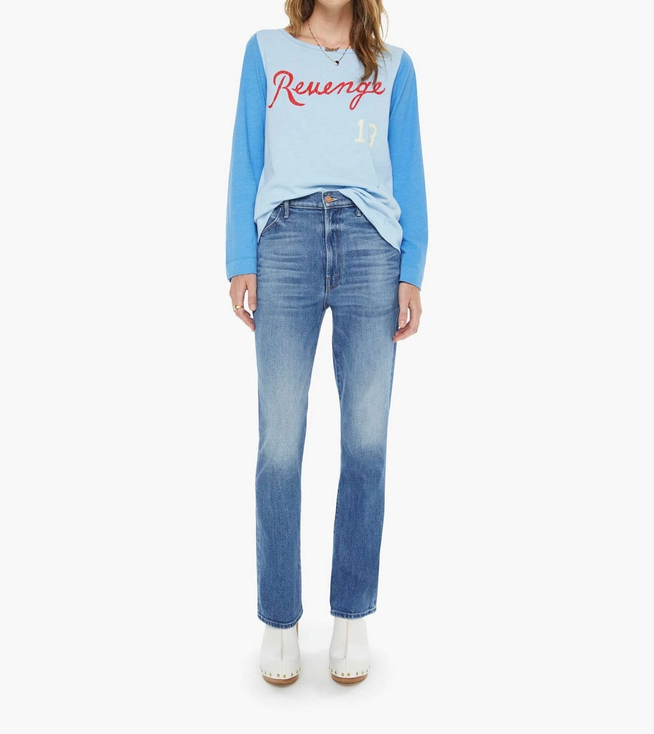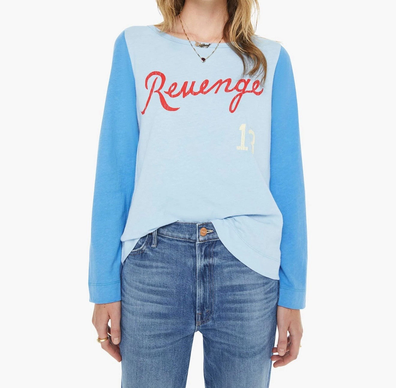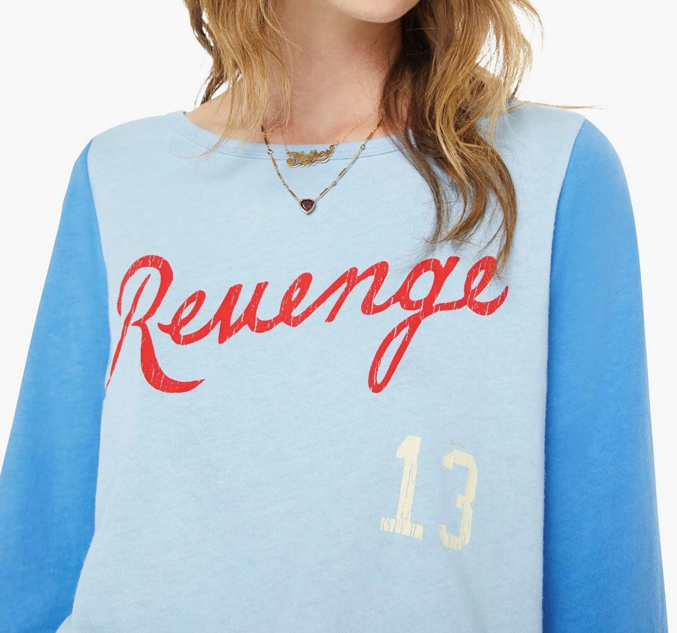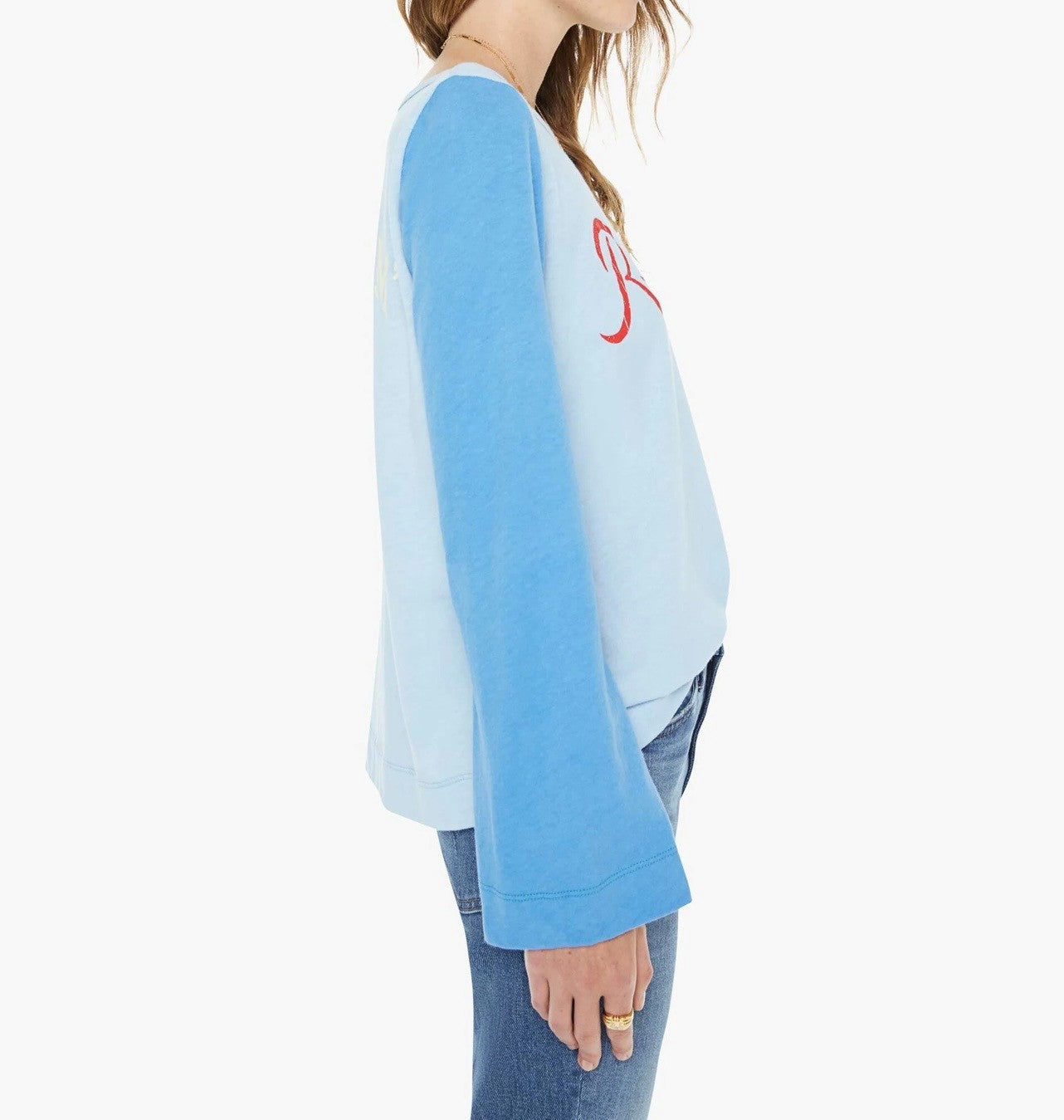 Settle the score. An athletic-inspired long-sleeve crewneck with a loose, comfortable fit. Made from 100% cotton in light blue with dark blue sleeves, the shirt is designed with a red text graphic on the front.