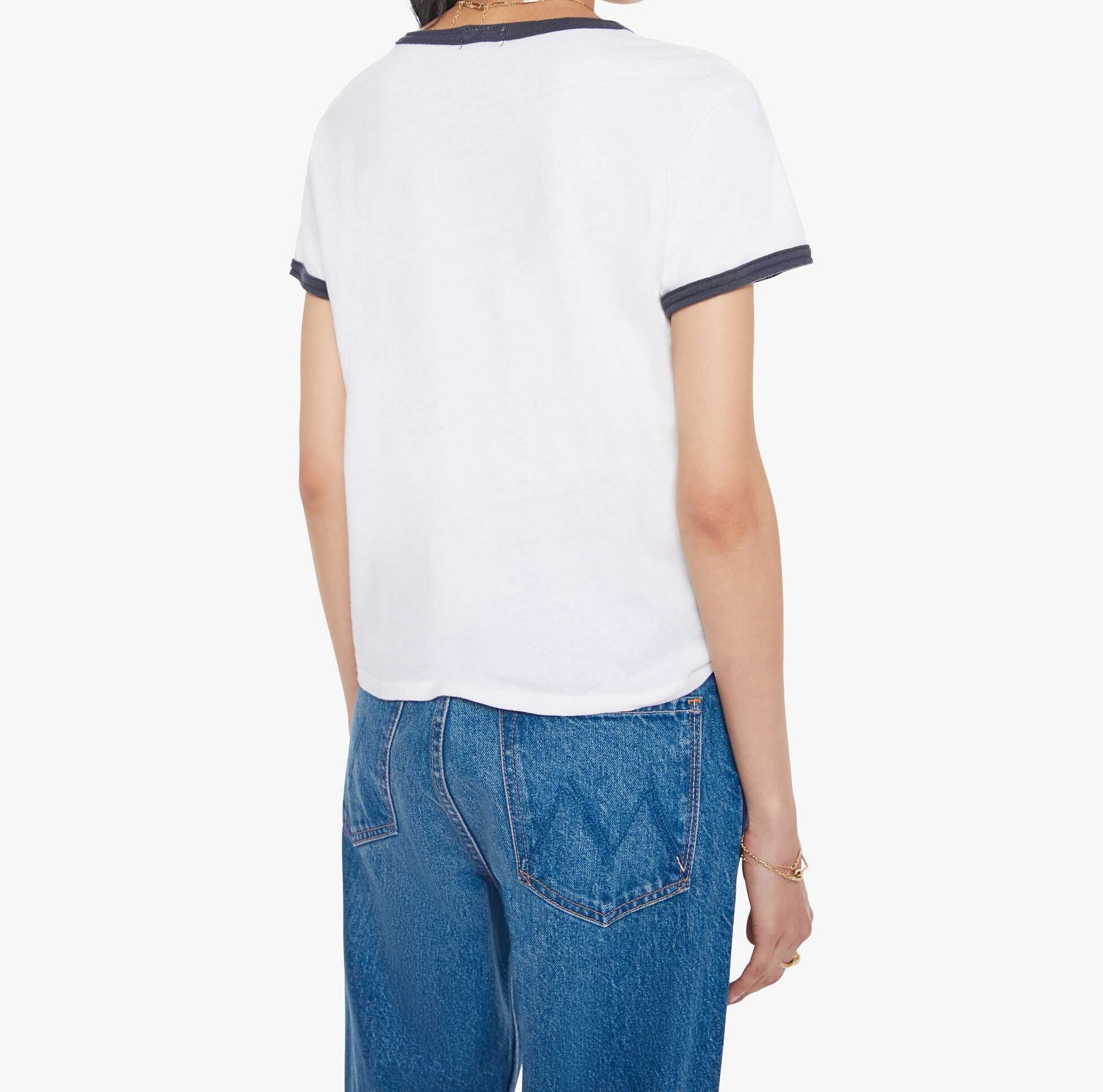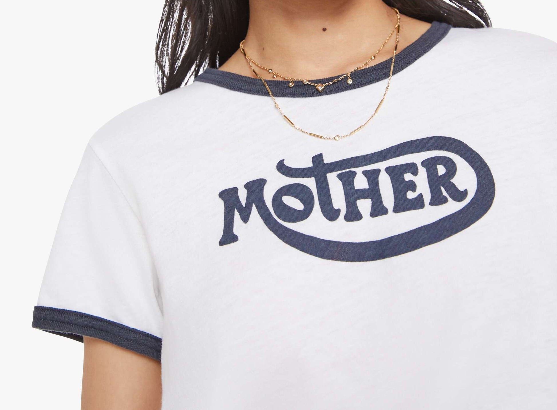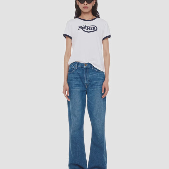 Born to ride. A crewneck tee with short sleeves and a slightly shrunken fit. Made from a recycled cotton blend in white with navy trim, the tee features MOTHER's name on the front.