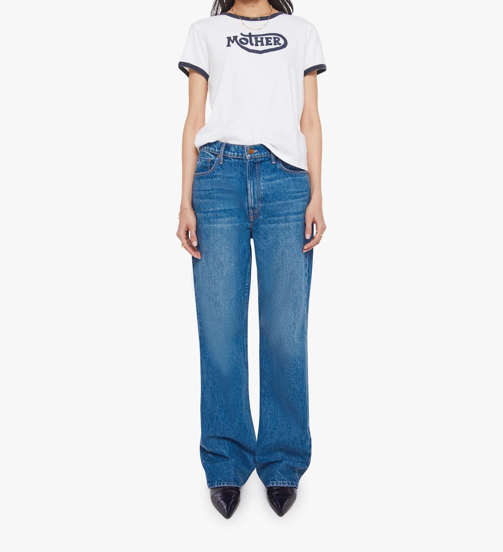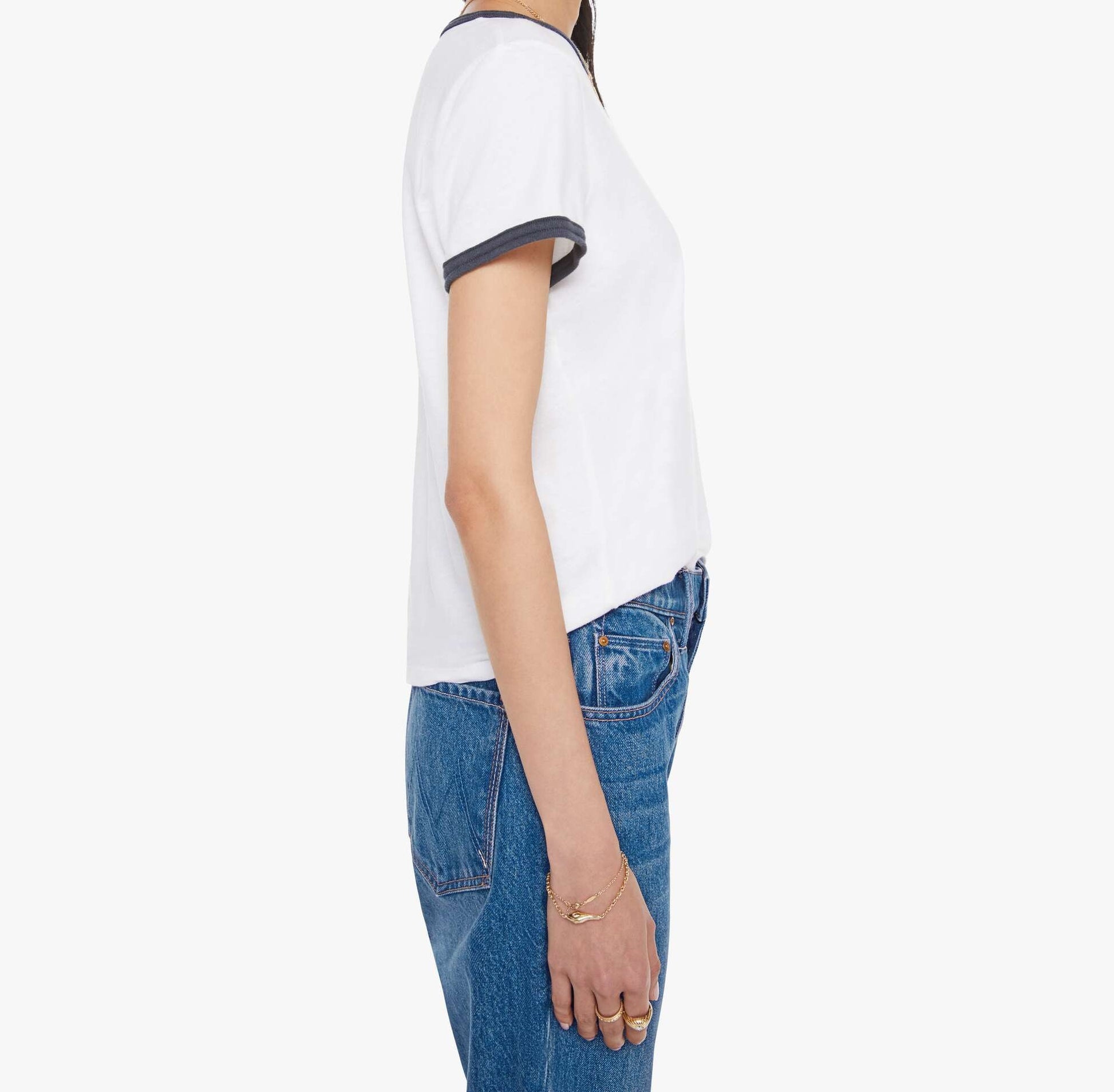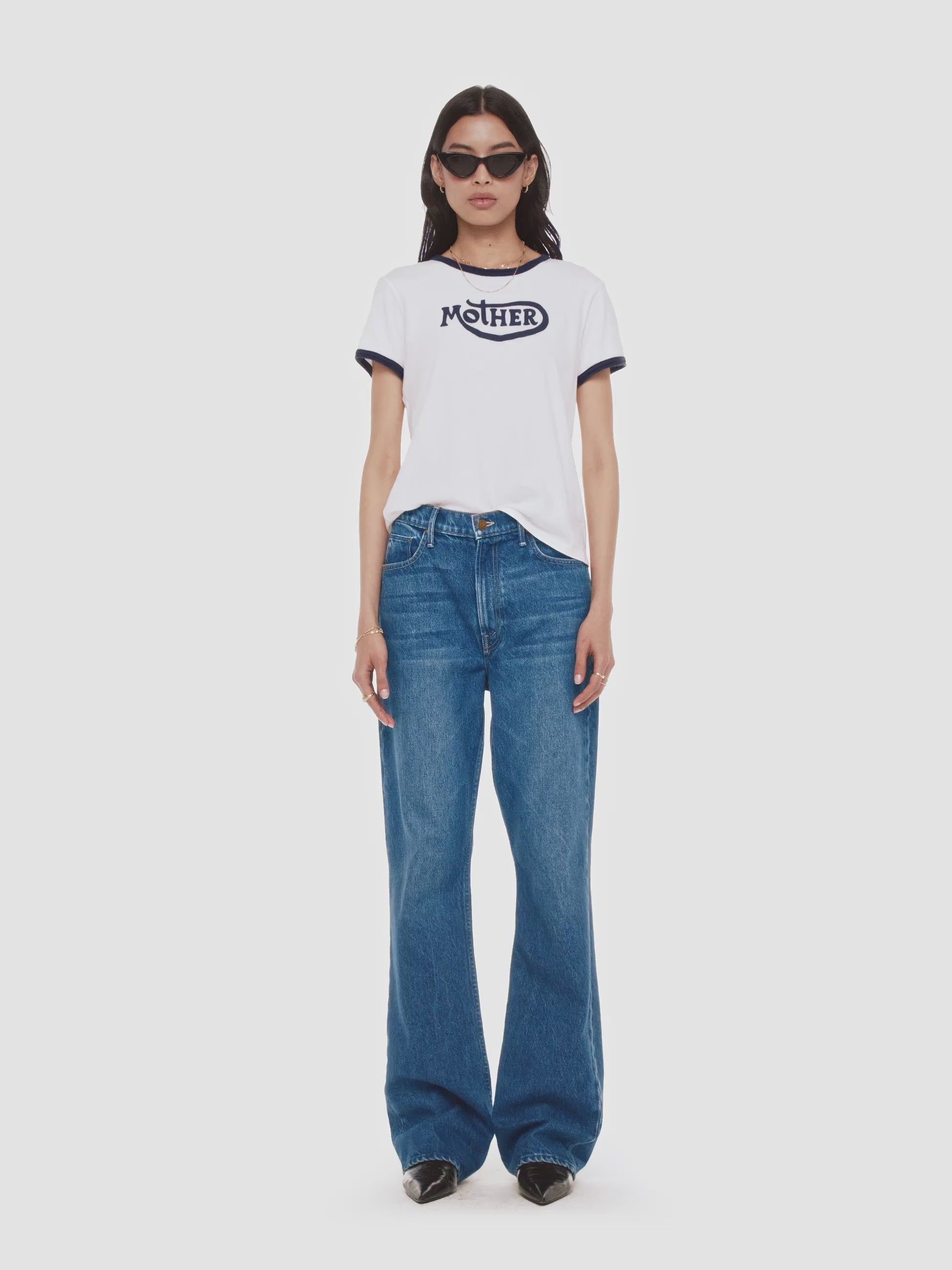 Born to ride. A crewneck tee with short sleeves and a slightly shrunken fit. Made from a recycled cotton blend in white with navy trim, the tee features MOTHER's name on the front.