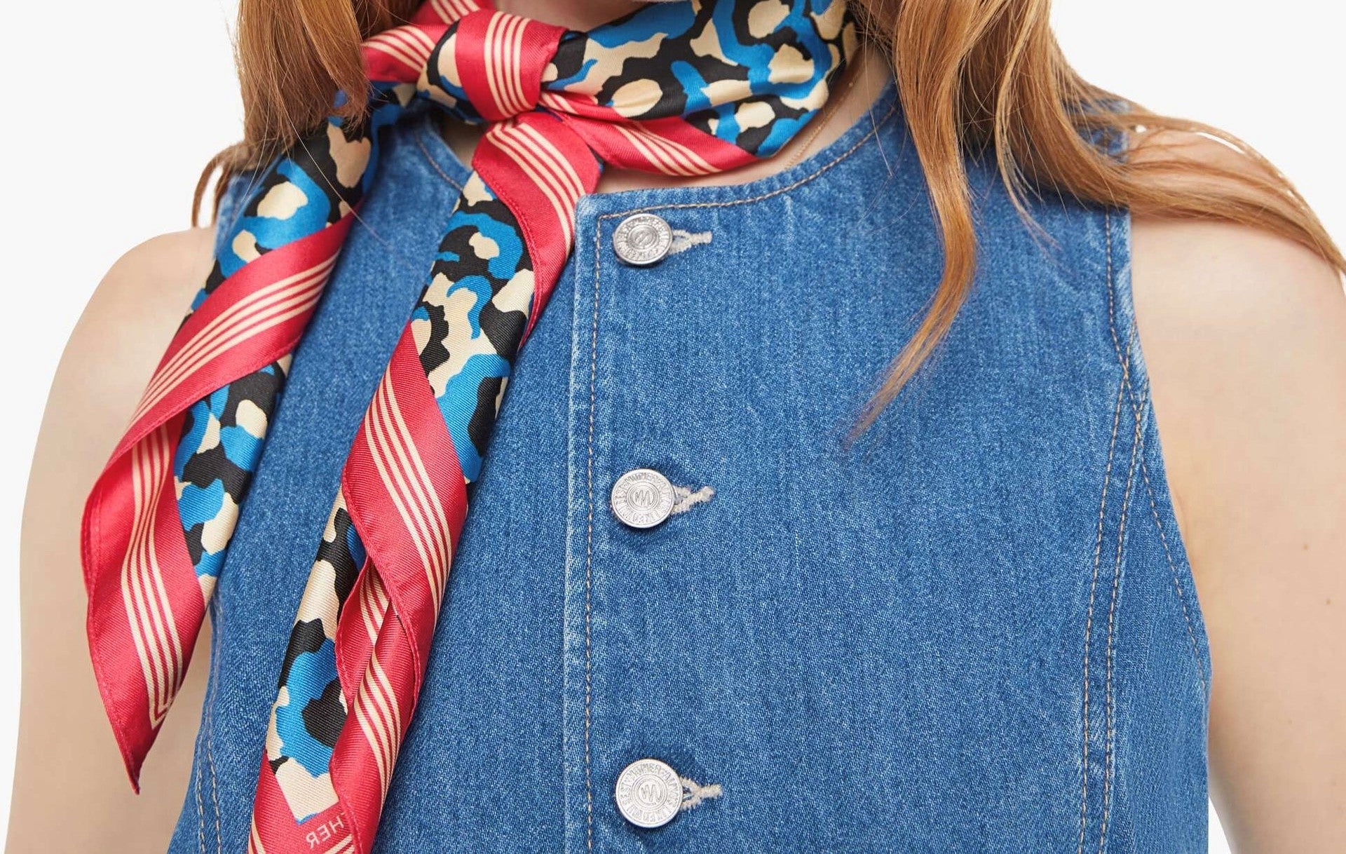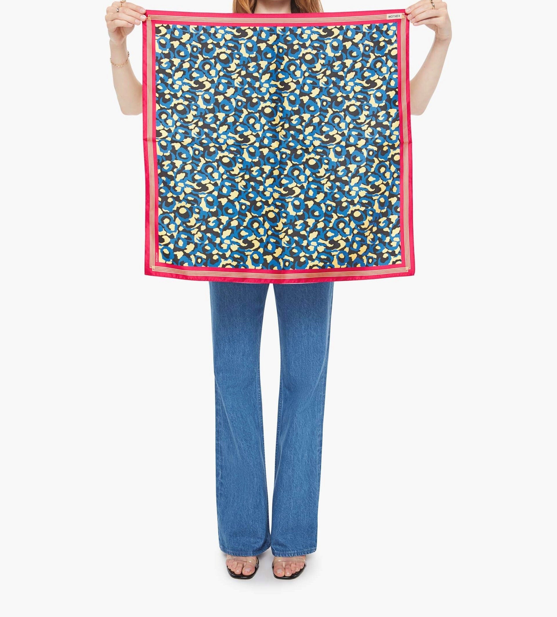 Spot on. A square scarf designed to be worn around the neck, on your head or tied on a bag. Made from 100% silk, Soft Spot is a white, blue and black leopard print with pink and red trim.